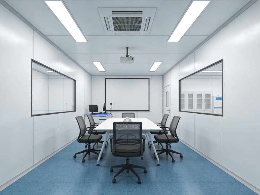 內(nèi)部研發(fā)空間均以藍(lán)色耐磨防靜電地坪搭配白色無縫抗菌墻面,視覺清爽且適配研發(fā)需求。藍(lán)色地面選用高耐磨環(huán)氧材質(zhì),具備良好的承重性與易清潔性,可耐受實驗試劑殘留擦拭,同時兼具輕微防靜電性能,保護(hù)精密研發(fā)設(shè)備;白色墻面采用環(huán)保抗菌涂層,平整度高且減少光線反射,搭配嵌入式護(hù)眼照明,營造舒適的研發(fā)視覺環(huán)境。