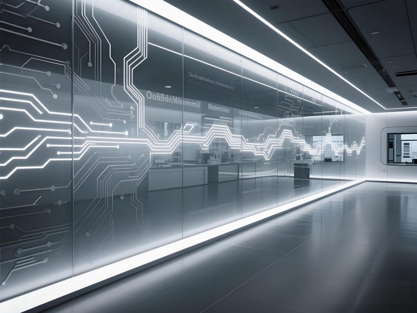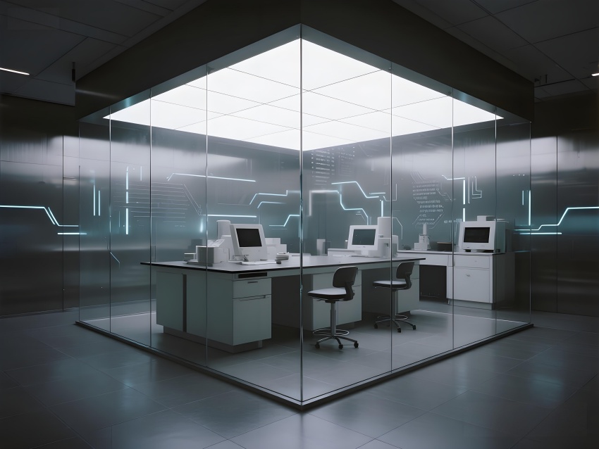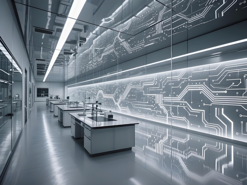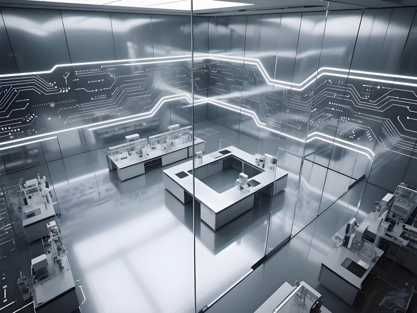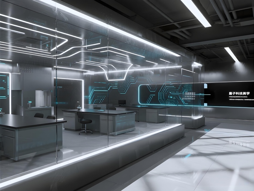 本實(shí)驗(yàn)室采用"量子科技美學(xué)"設(shè)計(jì),將納米尺度的精密感轉(zhuǎn)化為空間敘事。主實(shí)驗(yàn)區(qū)以鏡面銀與深空灰為基調(diào),半透明防輻射玻璃墻體內(nèi)嵌電路板紋理光帶,象征微觀世界的電子軌跡。百級(jí)潔凈區(qū)的金色氣流箭頭與千級(jí)區(qū)的藍(lán)色光暈形成能級(jí)躍遷般的視覺(jué)分級(jí),CVD設(shè)備艙的蜂窩狀散熱孔與懸浮式控制面板構(gòu)成未來(lái)工廠意象。地面導(dǎo)光纖維模擬分子結(jié)構(gòu)網(wǎng)絡(luò),天花板動(dòng)態(tài)粒子監(jiān)測(cè)屏以數(shù)據(jù)流形式投射納米顆粒分布。通過(guò)冷調(diào)LED與設(shè)備熒光的層次照明,在滿足EMI屏蔽與化學(xué)防護(hù)需求的同時(shí),創(chuàng)造出如同操作量子領(lǐng)域的沉浸式科研環(huán)境,透明氣閘門上的全息警示標(biāo)志進(jìn)一步強(qiáng)化尖端材料研究的科技儀式感。