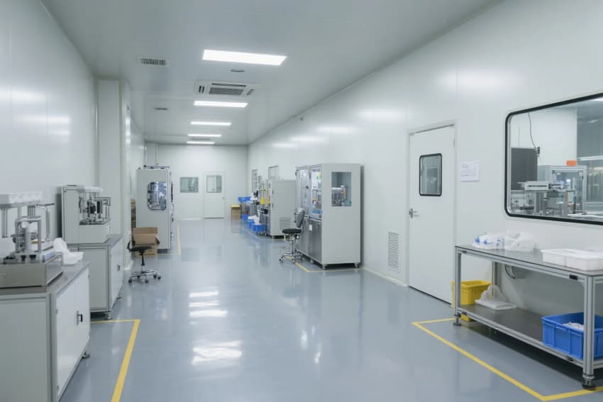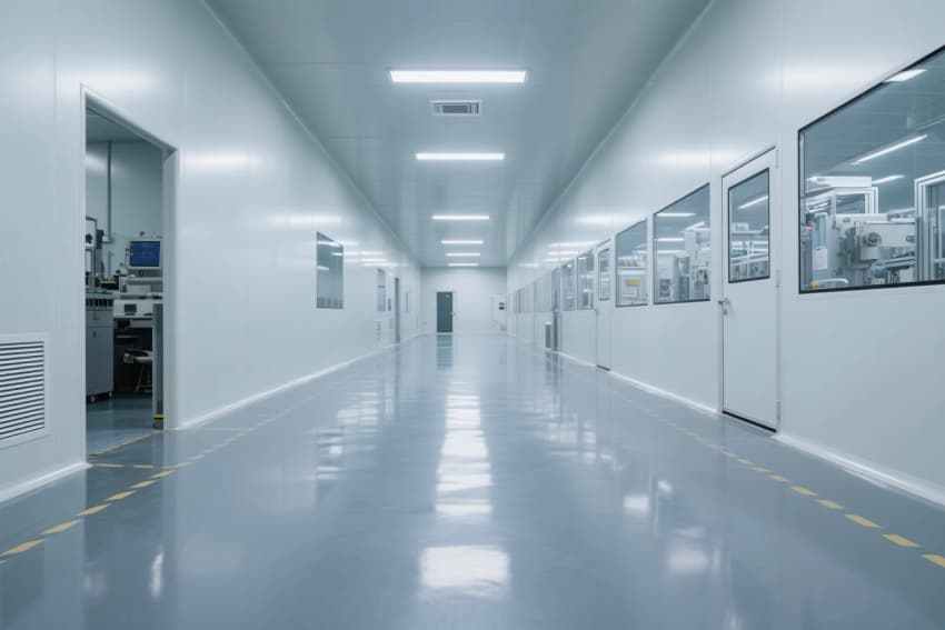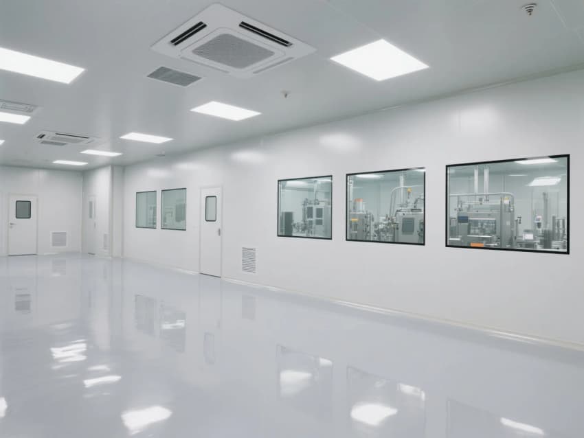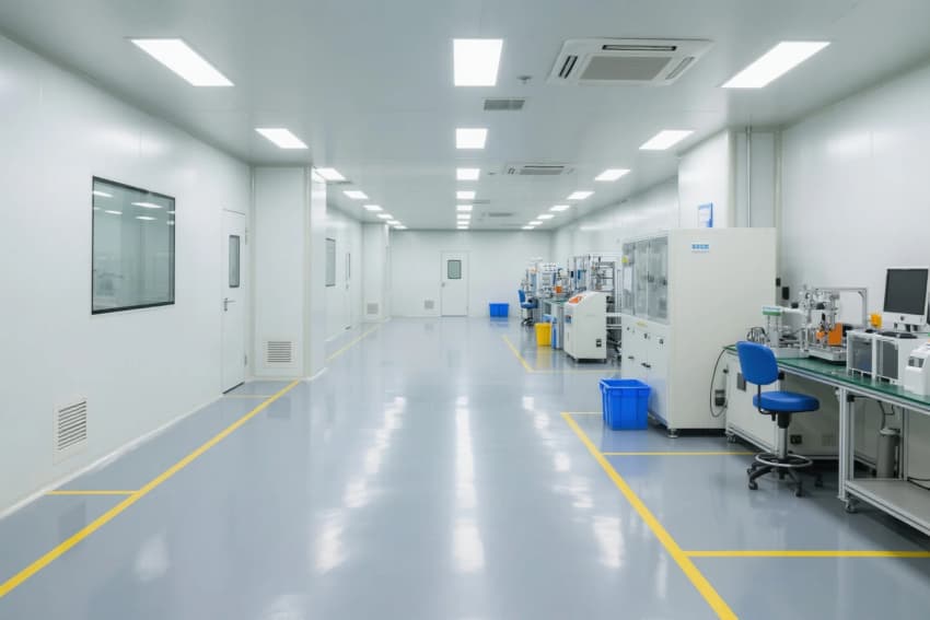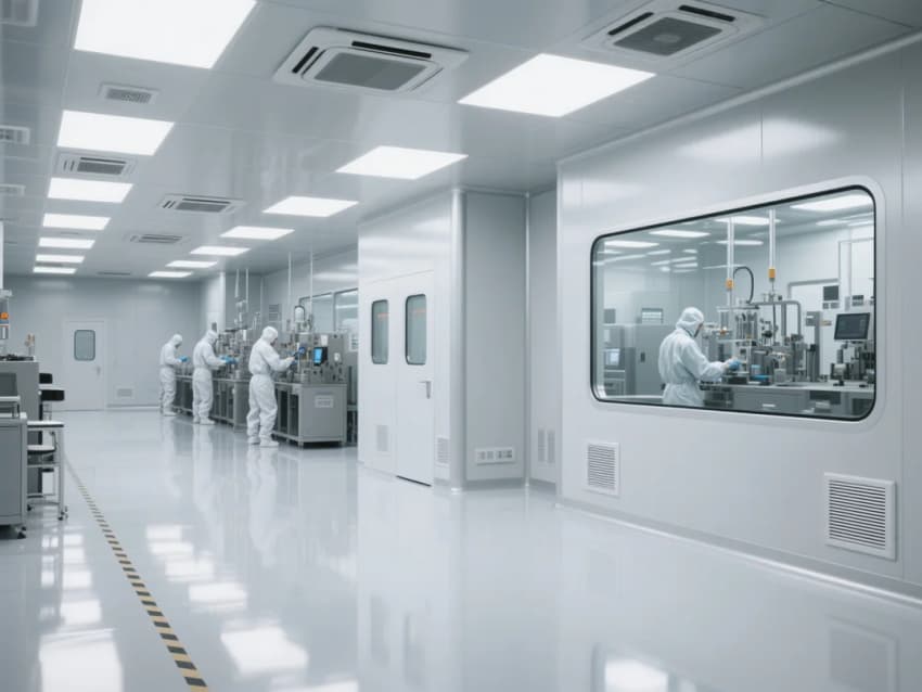 本工程嚴格依據ISO14644-1Class7潔凈標準,采用"工業4.0"設計理念,打造智能化電子光伏生產環境。主體結構采用模塊化潔凈室系統,50mm厚深灰抗菌彩鋼板墻體與淺灰防靜電環氧自流平地坪形成未來工業美學基調,表面電阻穩定控制在10^6-10^9Ω范圍。