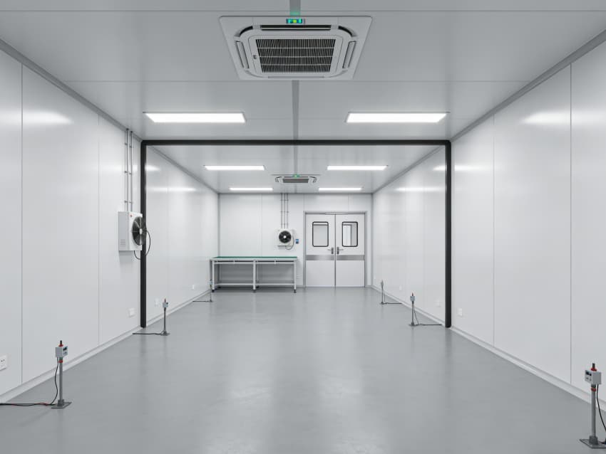 核心施工工藝,嚴(yán)控潔凈與防護(hù)性能。圍護(hù)結(jié)構(gòu)選用0.8mm厚工業(yè)級(jí)抗菌彩鋼板,芯材采用防火保溫巖棉,拼接處用專用潔凈密封膠滿填,膠縫寬度3-5mm無氣泡、無開裂,墻角做≥50mm圓弧處理,避免微粒堆積與清潔死角。地面采用無縫防靜電環(huán)氧自流平,表面電阻控制在10?-10?Ω,平整度誤差≤2mm,耐磨損、易消殺,同時(shí)鋪設(shè)防靜電接地系統(tǒng),杜絕靜電損壞精密顯示組件;墻面、吊頂光滑平整,無揚(yáng)塵、無脫落,適配高頻消殺需求。