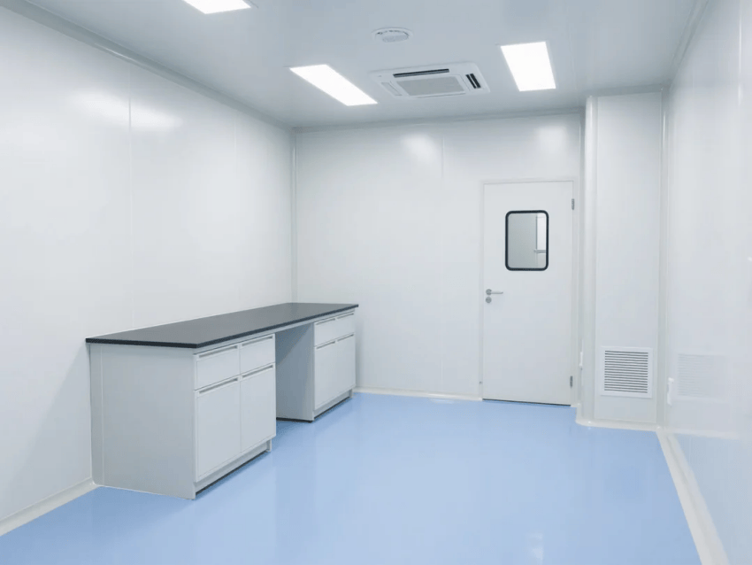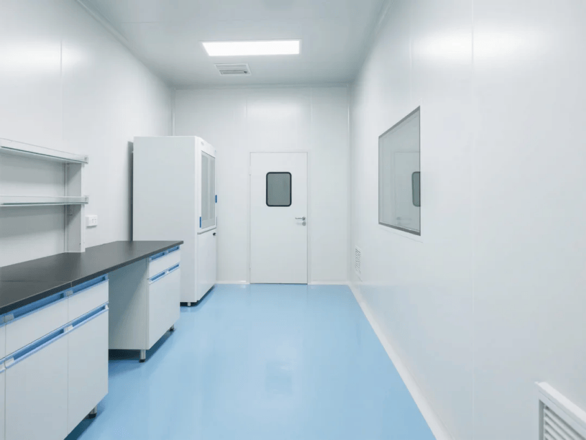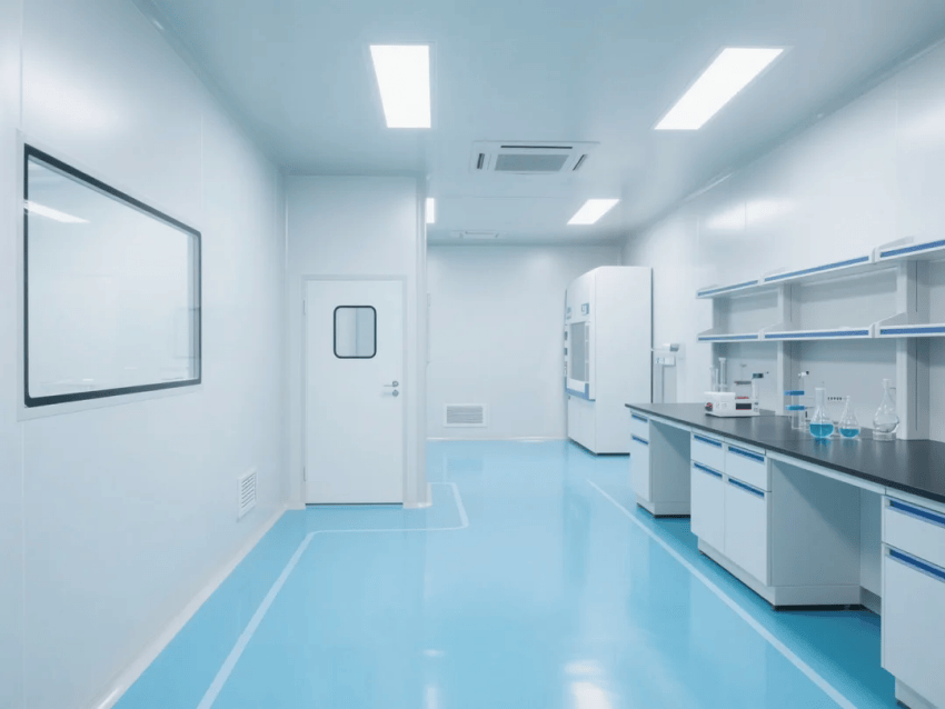 本方案采用生物科技極簡風格,嚴格遵循ISO14644-1Class6潔凈標準。空間以純白抗菌彩鋼板墻體與淺藍環(huán)氧樹脂地坪構建主體框架,營造純凈、高效的檢測環(huán)境。墻體采用50mm厚醫(yī)療級抗菌彩鋼板,所有接縫處采用R30mm圓弧處理工藝,確保無衛(wèi)生死角。淺藍環(huán)氧地坪添加防滑顆粒,摩擦系數(shù)≥0.6,同時具備優(yōu)異的耐化性。