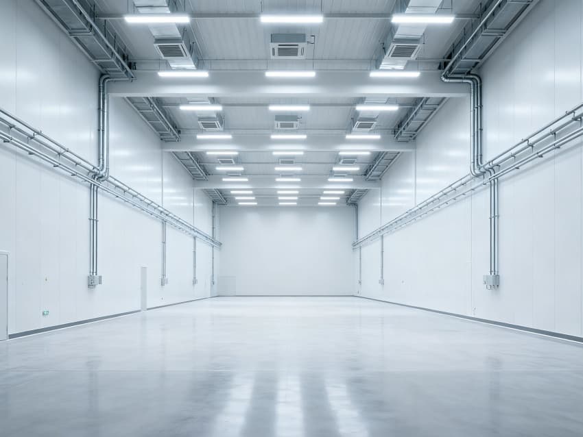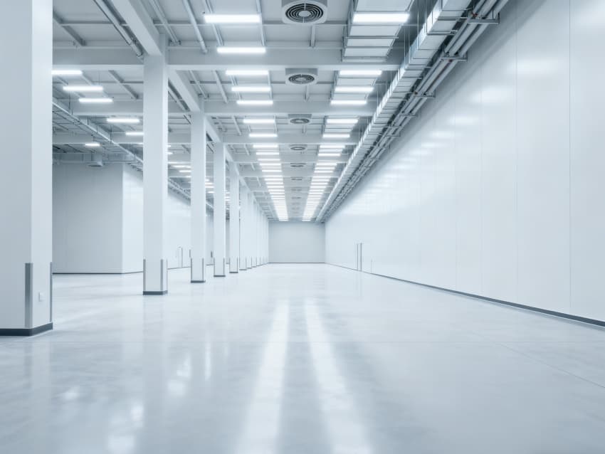 內(nèi)部6個生產(chǎn)車間均為無設(shè)備空曠布局,按工業(yè)級潔凈與承重標準建設(shè):地面鋪設(shè)耐磨防靜電環(huán)氧地坪,墻面采用白色環(huán)保潔凈墻板,陰陽角做圓弧處理減少積塵;柱網(wǎng)間距達10米,預(yù)留設(shè)備安裝與物流通道空間;頂部整合恒溫恒濕新風(fēng)系統(tǒng)與節(jié)能LED照明,管線暗藏于吊頂內(nèi),避免空間雜亂;車間之間通過通透玻璃隔斷銜接,進一步強化整體空曠感,為新能源產(chǎn)品規(guī)模化生產(chǎn)、柔性產(chǎn)線調(diào)整提供高效、潔凈的空間支撐。