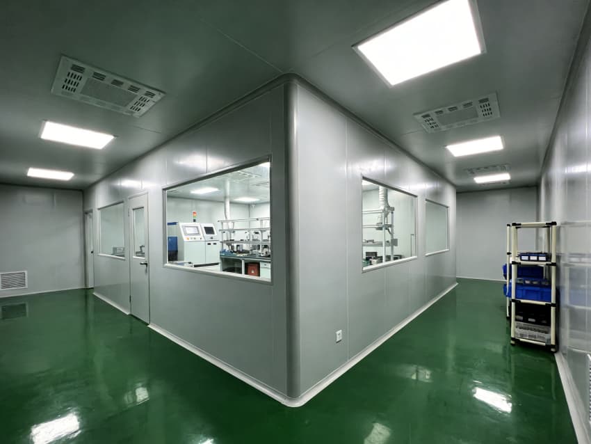 整體空間采用彩鋼板模塊化圍護(hù)系統(tǒng),墻面與頂板選用抗菌潔凈彩鋼板,搭配圓弧角收邊處理,徹底消除積塵死角;地面為綠色環(huán)氧自流平材質(zhì),兼具防靜電、耐磨、易清潔特性,滿足光器件生產(chǎn)對(duì)微塵管控的嚴(yán)苛要求。吊頂集成 FFU 風(fēng)機(jī)過濾單元與回風(fēng)系統(tǒng),可穩(wěn)定維持萬級(jí)潔凈度,為光芯片耦合、貼片封裝等核心工序筑牢環(huán)境基礎(chǔ)。