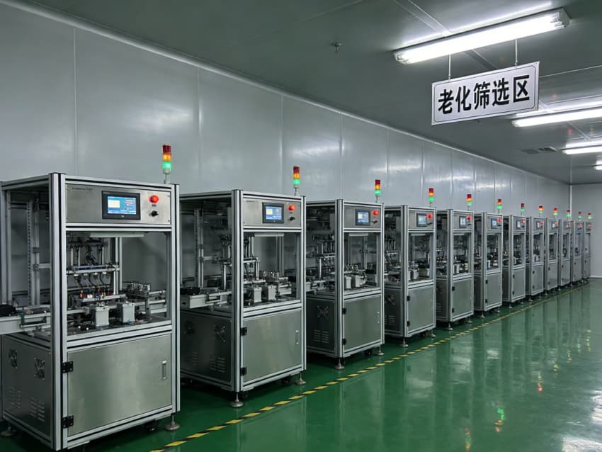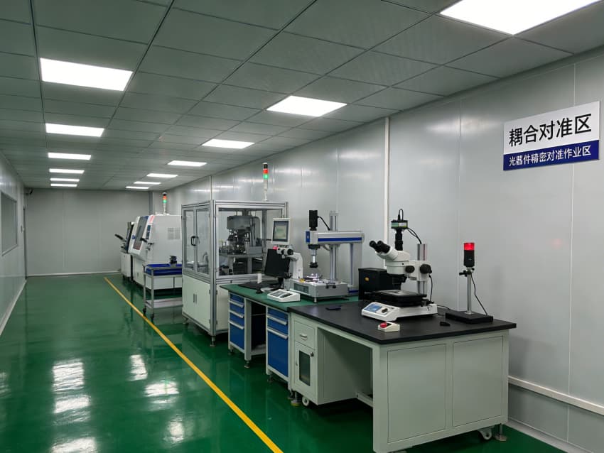 - 核心生產(chǎn)區(qū)以黃色警示線明確人車動(dòng)線,SMT 貼片工位配備防靜電工作臺(tái)與遮光防塵罩,保障貼裝精度;“耦合對(duì)準(zhǔn)區(qū)” 采用防震型實(shí)驗(yàn)臺(tái)與光學(xué)級(jí)照明,搭配密閉玻璃隔斷,為光器件微米級(jí)對(duì)準(zhǔn)作業(yè)提供穩(wěn)定、潔凈的操作環(huán)境。