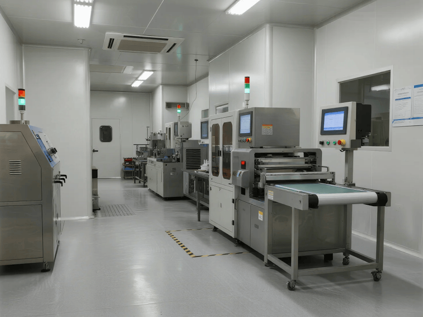 圍護系統:50mm厚白色抗菌彩鋼板墻體,接縫采用無縫焊接工藝,配合R30mm圓弧收邊,確保無粉塵積聚死角;