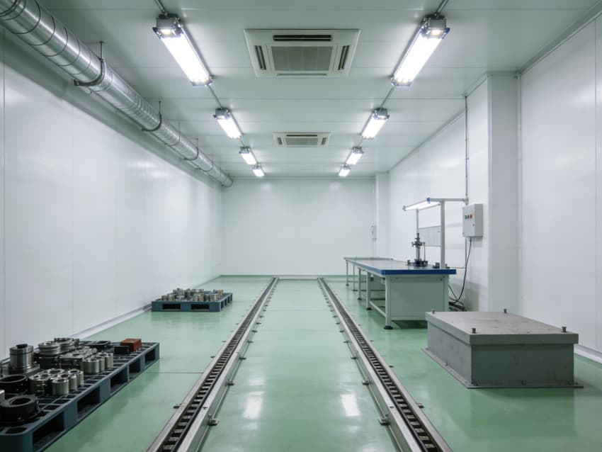 車間內(nèi)部施工工藝凸顯工業(yè)適配性:地面采用淺綠色防油耐磨環(huán)氧地坪工藝,經(jīng)基層固化處理、環(huán)氧砂漿找平、耐磨骨料撒布、罩面封閉四道核心工序,表面平整度誤差≤0.8mm/m,抗壓強(qiáng)度達(dá)C30以上,可耐受設(shè)備碾壓與油污侵蝕;墻面采用白色工業(yè)級(jí)潔凈涂層施工,推行無縫拼接技術(shù),陰陽(yáng)角采用R40圓弧倒角工藝,杜絕積塵死角,涂層附著力強(qiáng),可耐受高頻次清潔與工業(yè)粉塵侵蝕。